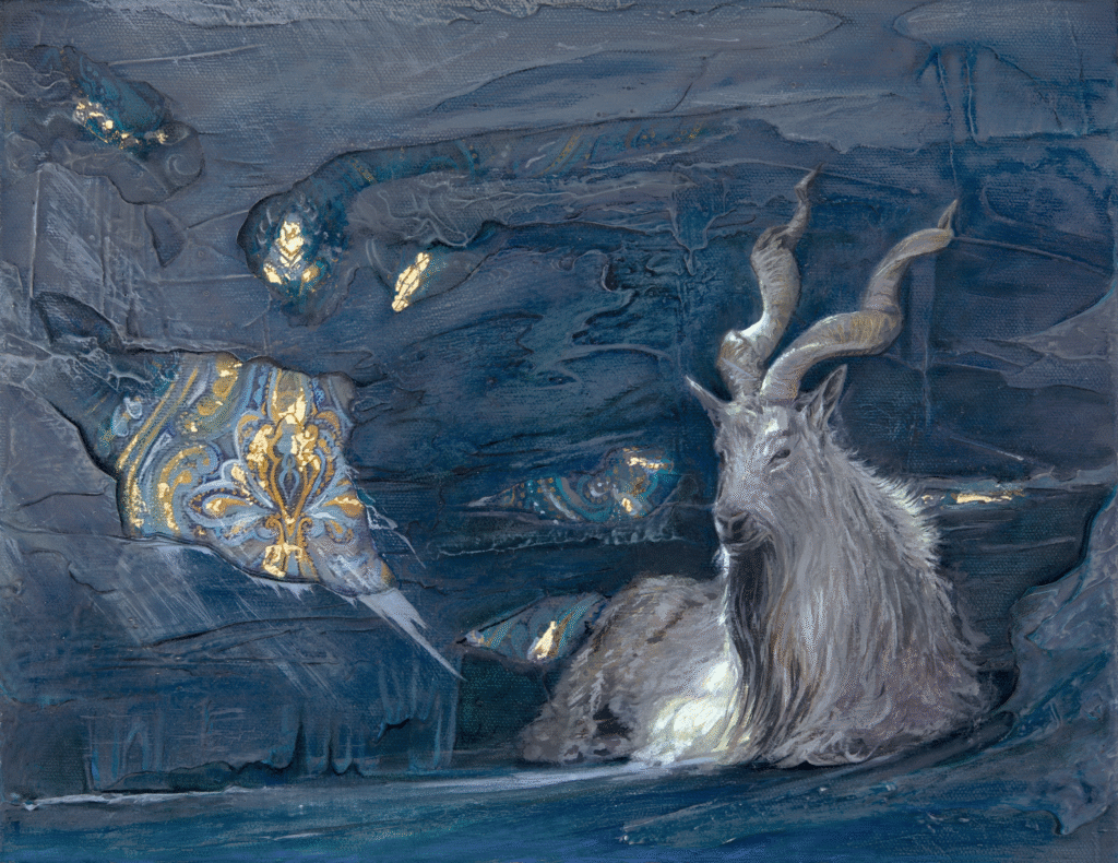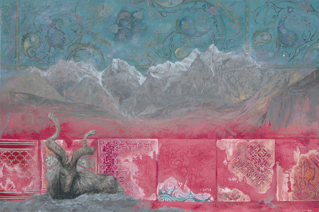 The lush pink painting mountainous Himalayan background would typically have the River Indus running through it – instead, in this image, it is just a crackling dry river bed. I wanted the image to be both a cultural celebration and a thought provoking piece – with a fine balance of beauty and awareness.  The traditional patterns on the tiles are intricate and rich but cracking in the draught. The goats coat is thick and the horns speckled in 24 carat gold leaf, yet the animal lacks life in its posture. My paintings typically have great movement in the wildlife and this was very purposeful not to.