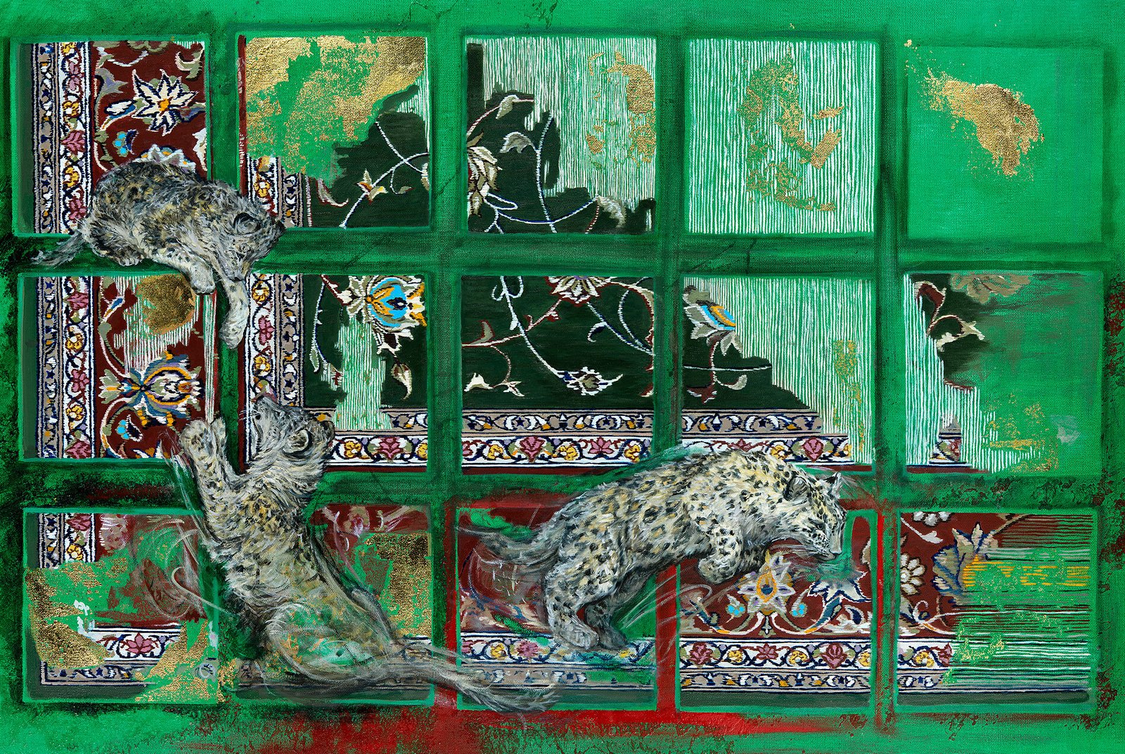 “The fluffy leopard cubs are playful and agile, bounding with energy. In their natural habitat the Persian leopard will have 2 – 4 cubs at a time and I wanted to paint the cubs healthy, but to allude to something rather sad. In the painting they are moving away from a point on the canvas where the image itself starts to disappear. The fierce red is both beautiful against the contrasting greens and acts as a warning to both the cubs and viewers. The fear of what might be lost if we do not start to act and think differently was a message in the painting that I wanted to bring out. They are endangered. In 2008, there were an estimated 871–1,290 mature leopards of which 550–850 lived in Iran; and numbers are still declining.