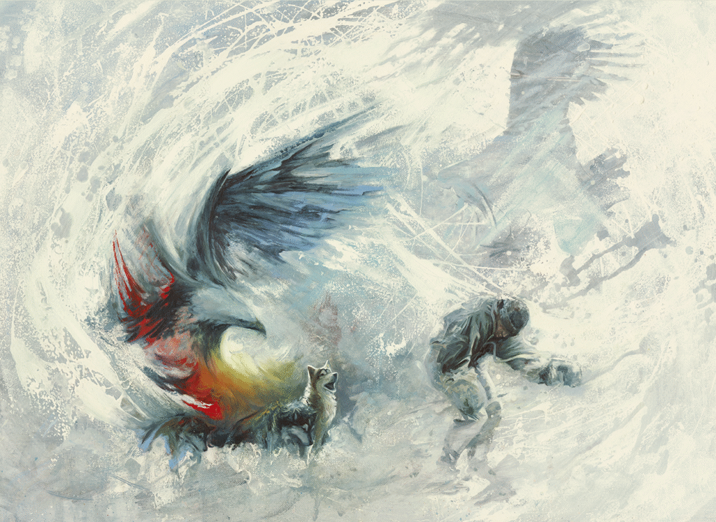 One might ask how a musher would tell apart a dream from reality at a time like this, some may pinch themselves, but most will tell you they check for the dogs’ reaction. Their ears go back, they speed up in excitement, they can sense a moose on the trial a long time before you see it. In this painting, the lead dog has spotted the arrival, it is the oncoming of the eagles. Here, with a single beat of a wing, heat is fanned onto the dogs, as the other wing diverts the bitter cold. It is as if the eagle spirits of the summit have deemed the team worthy of safe passage, and they shall make it so.